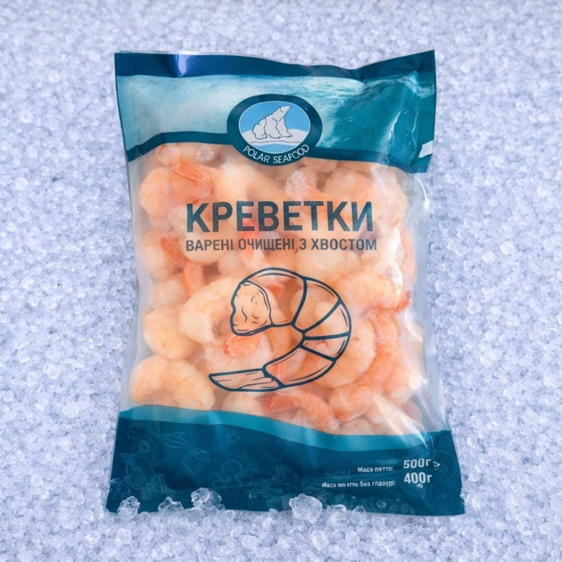 | Готовність: | Варено-морожена, чищена з хвостом |