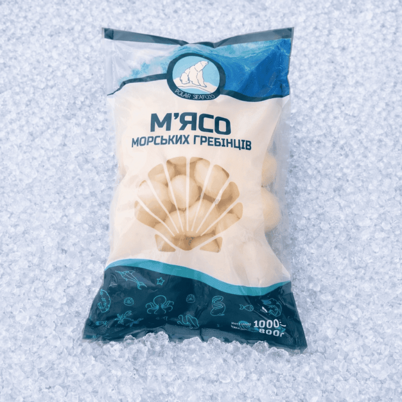 Добірне м'ясо морського гребінця, виловленого в екологічно чистих водах. Розмір калібру 40/60 означає, що в 1 кг міститься 40-60 добірних цільних м'язів, оптимальних за розміром для універсального використання.